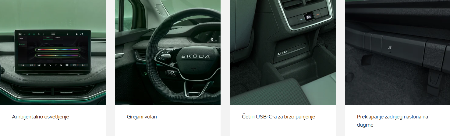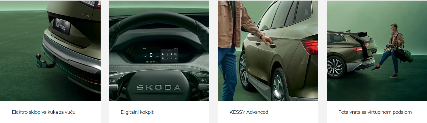 Cena od na početnom baneru model stranice označava trenutnu početnu punu cenu za najniži paket opreme konkretnog Škoda modela i prikazana je u EUR. U segmentu izbor opreme cena od označava trenutnu početnu punu cenu za dostupne pakete opreme za konkretan Škoda model i prikazane su u EUR. Već od cena na promo banerima na naslovnoj strani označava trenutnu promo cenu za određenu verziju Škoda modela i prikazana je u EUR. Zadržavamo pravo izmene cena i specifikacija opreme bez prethodne najave. Za konačnu cenu vozila kontaktirajte ovlašćenog Škoda partnera. Plaćanje je u dinarskoj protivvrednosti po srednjem kursu Narodne Banke Srbije za devize na dan plaćanja. U cenu vozila je uračunata carina, carinske dažbine, svi zavisni troškovi i PDV, do skladišta prodavca. U cenu nije uračunata dodatna oprema. * Dostupnost maksimalne električne snage može da bude ograničena. Količina raspoložive snage u pojedinačnim situacijama u vožnji zavisi od različitih faktora, kao što su temperatura okoline i status punjenja, temperatura i stanje ili fizička starost visokonaponske baterije. **Verzije vRS (250kW) i 85x (210kW) Maksimalna električna snaga 250kW/210 kW: Maksimalna snaga kojoj se može pristupiti maksimalno za 30 sekundi, izračunato u skladu sa UN GTR.21. Količina raspoložive snage u pojedinačnim situacijama u vožnji zavisi od različitih faktora, kao što su temperatura okoline i status punjenja, temperatura i stanje ili fizička starost visokonaponske baterije. Dostupnost maksimalne snage zahteva da visokonaponska baterija bude između 23°C i 50°C i da ima nivo napunjenosti > 88%. Naročito odstupanja od navedenih parametara mogu dovesti do smanjenja snage, do potpune nedostupnosti maksimalne snage. Na temperaturu baterije u određenoj meri može indirektno uticati pomoćni klima uređaj i nivo napunjenosti se može, na primer, podesiti u vozilu. Količina raspoložive snage u određenom trenutku prikazana je na displeju snage vozila. Da bi se upotrebljivi kapacitet visokonaponske baterije održao što efikasnije, preporučuje se punjenja baterije od 80% ako se vozilo koristi svakodnevno (da se prebaci na 100%, na primer, pre putovanja na duge udaljenosti).