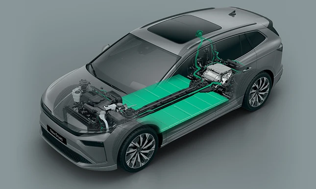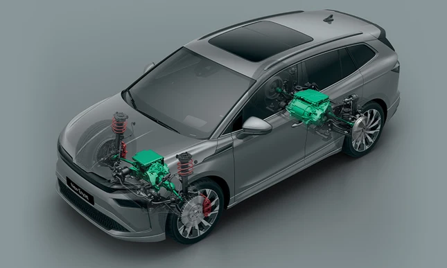 Elektromotor postavljen na zadnju osovinu može biti dopunjen drugim elektromotorom na prednjoj osovini. Ovo pretvara Enyaq u pogon na sva četiri točka.