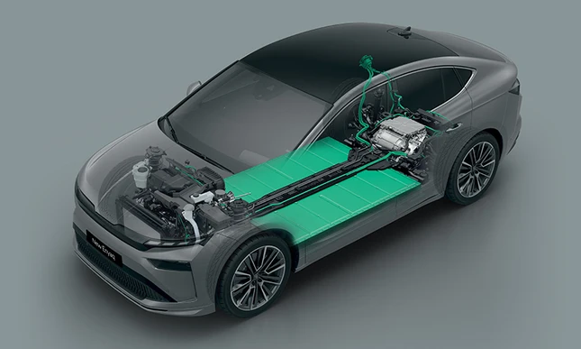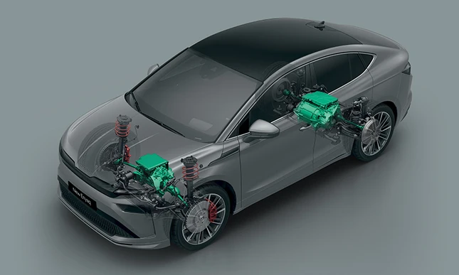 Elektromotor postavljen na zadnju osovinu može biti dopunjen drugim elektromotorom na prednjoj osovini. Ovo pretvara Enyaq Coupe u pogon na sva četiri točka.